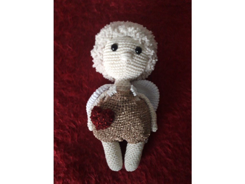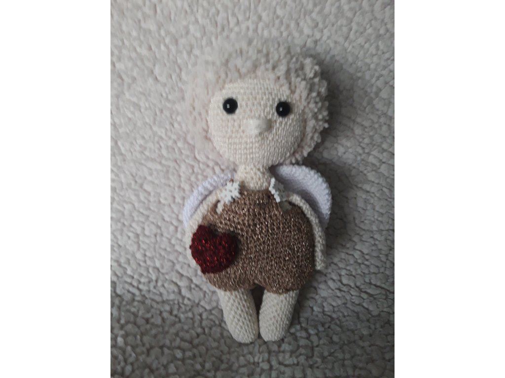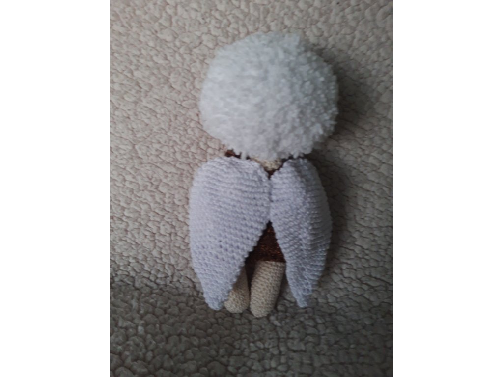 Tělíčko a křídla andílka jsou z příze Giza 100% mercerizovaná egyptská bavlna, oblečení je příze Starleta 78% viskóza, 11% metalické vlákno, 11% polyamid, vlásky z příze Kuzu 100% micro polyester